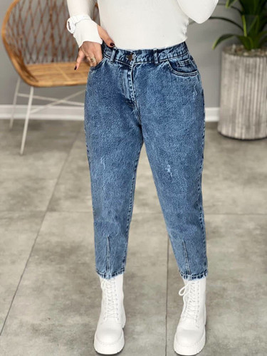 شلوار جین مام فیت جلو دکمه پشت کمر کش قد۹۰